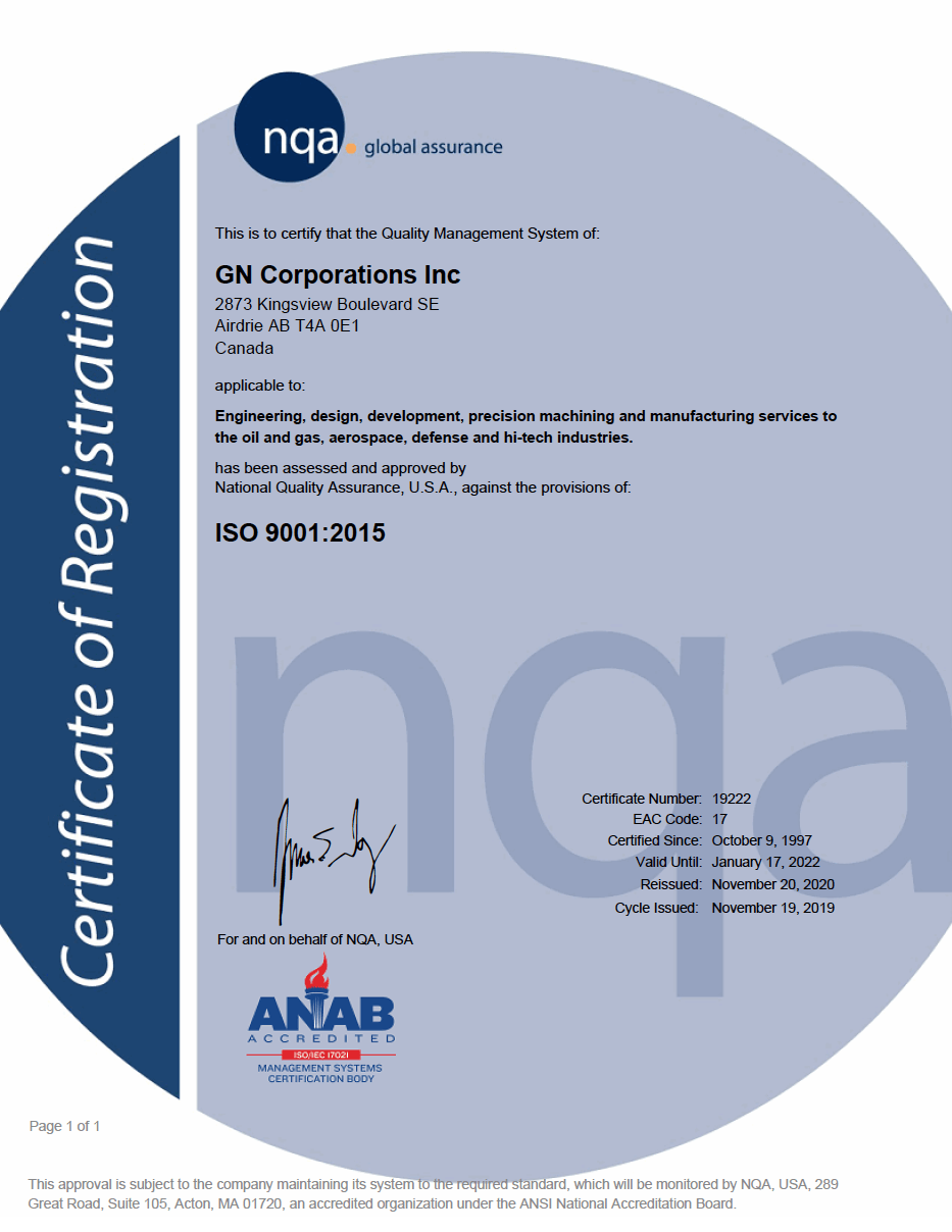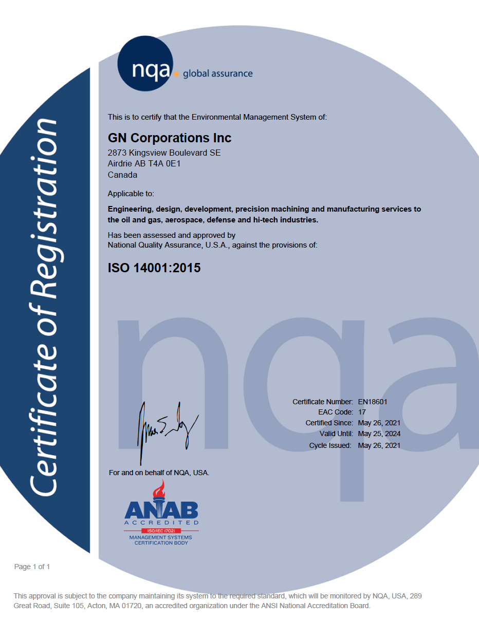 We have high standards for everything we do, including our 5-axis machining. GN maintains full compliance with industry certifications and standards, including AS9100D, Controlled Goods Program, and relevant ISO standards.